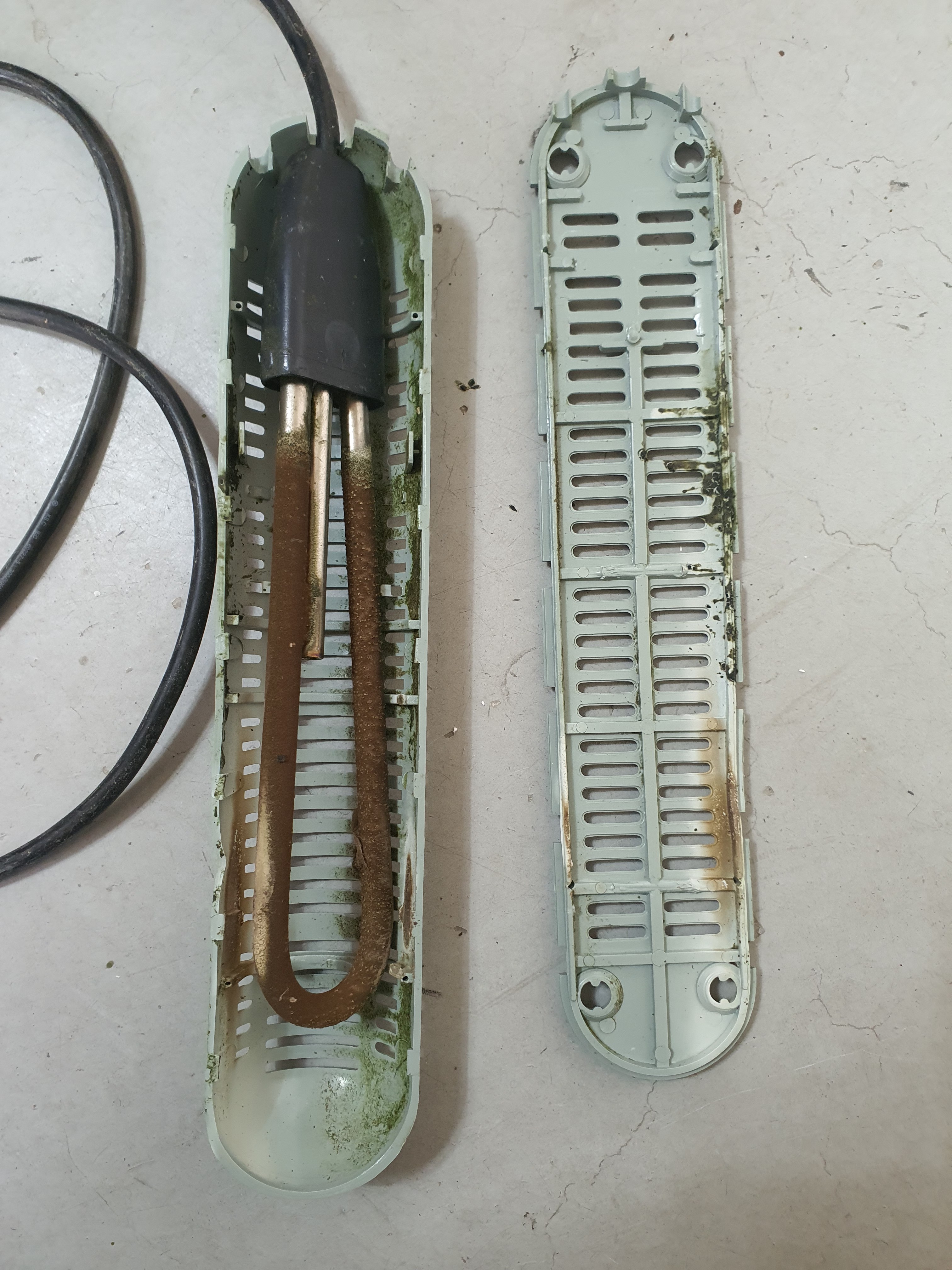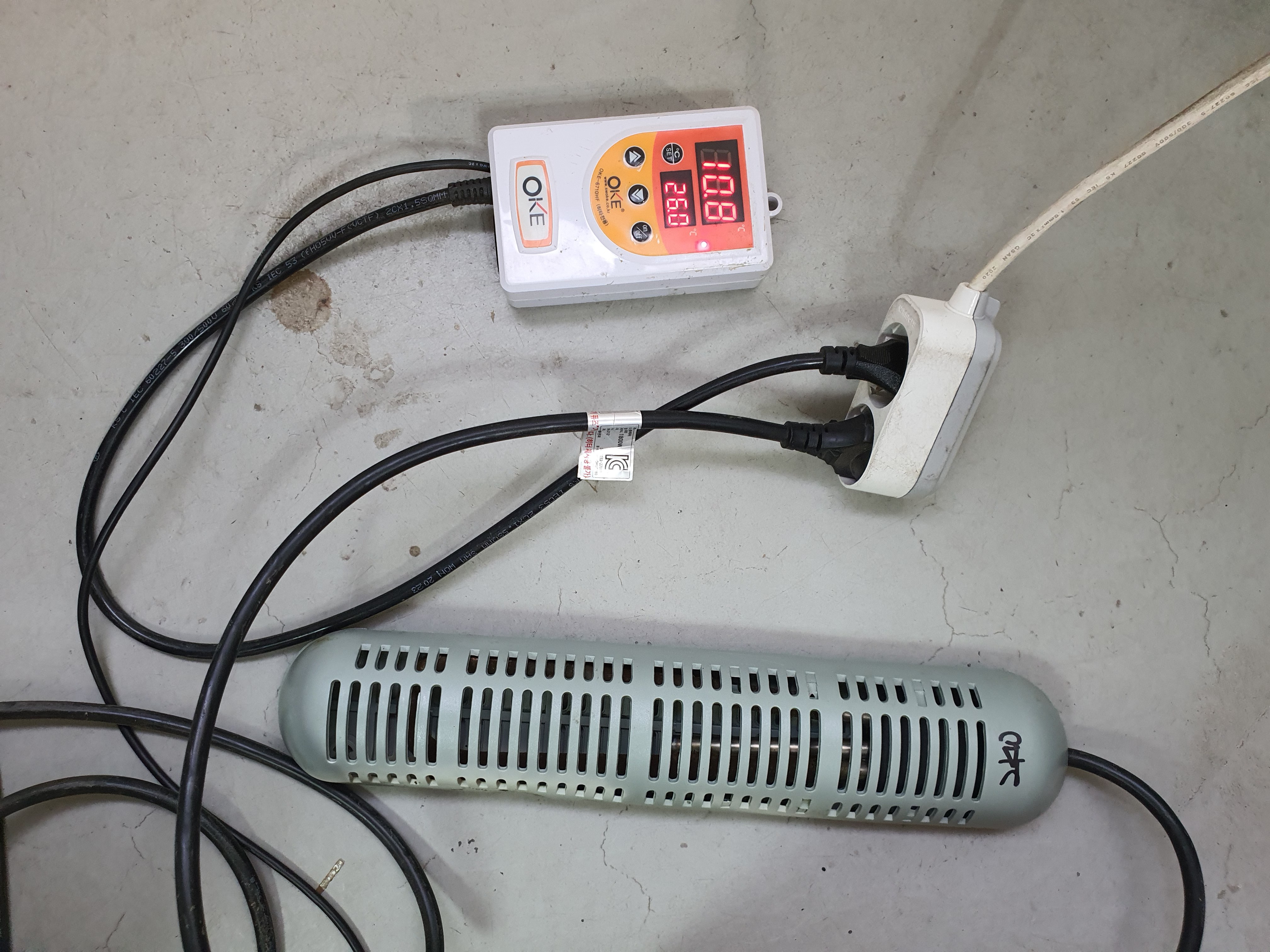 같이 히터 플러그를 다른 콘센트에 연결하여, 히터는 계속 작동돼 물은 계속 데워지고 온도조절기는 아무런 역할을 하지 않는다.---이런 경우가 수시로 일어남!